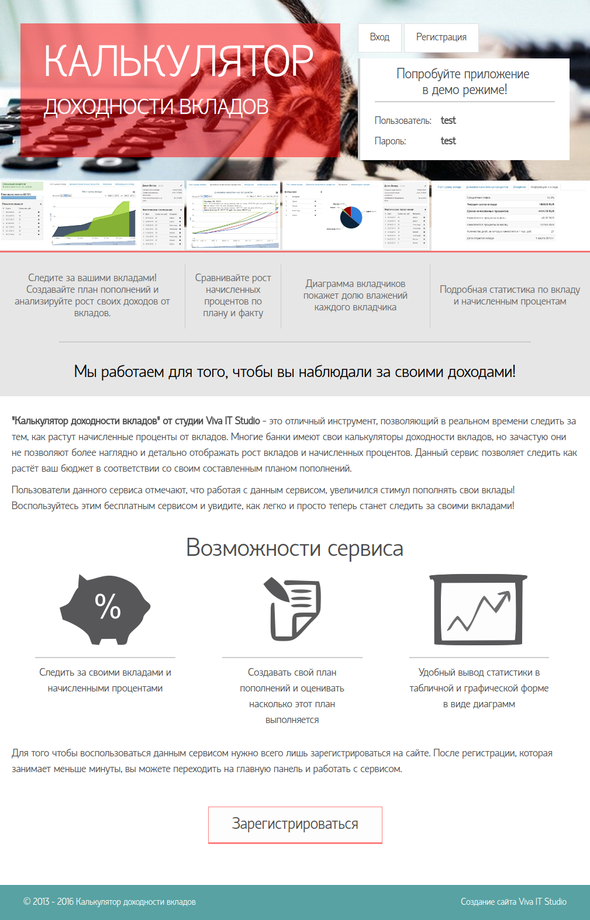 Вы можете попробовать данный сервис в действии под тестовым пользователем и, если понравится, зарегистрироваться на сайте абсолютно бесплатно, чтобы следить за доходом Вашего вклада.