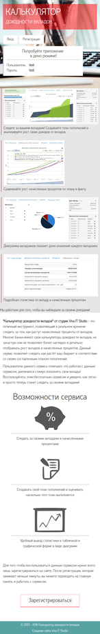 Калькулятор доходности вкладов - проект от нашей студии Viva IT Studio, позволяющий Вам следить за ростом начисленных процентов разных вкладов и строить их план пополнения.