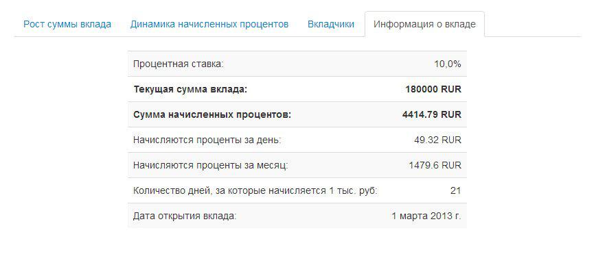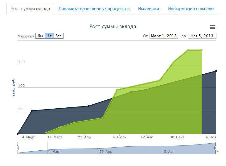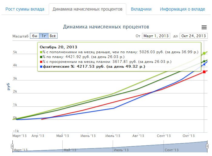 На сайте можно в удобной графической форме увидеть информацию о сумме вклада и начисленных процентах: