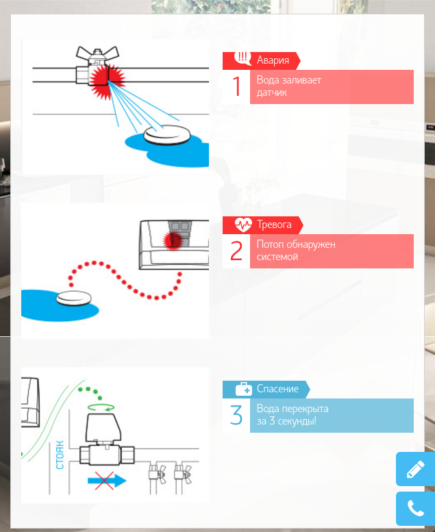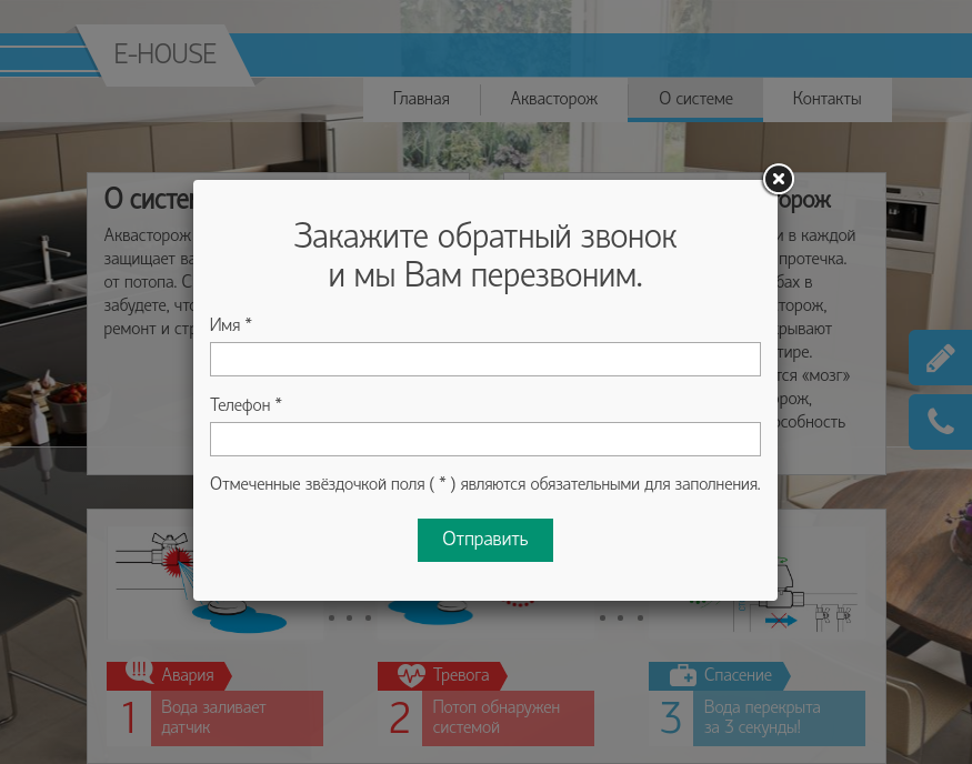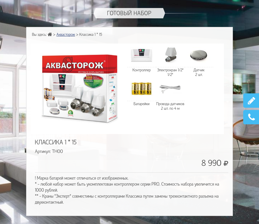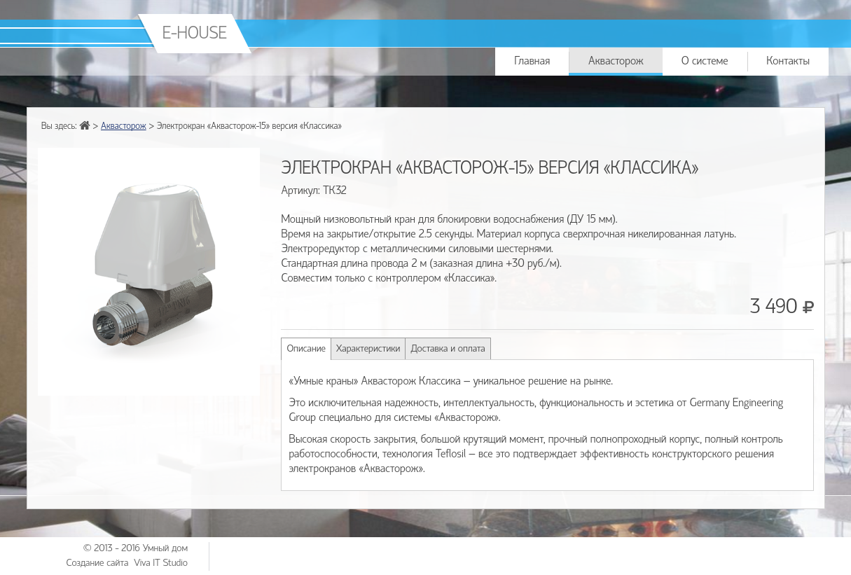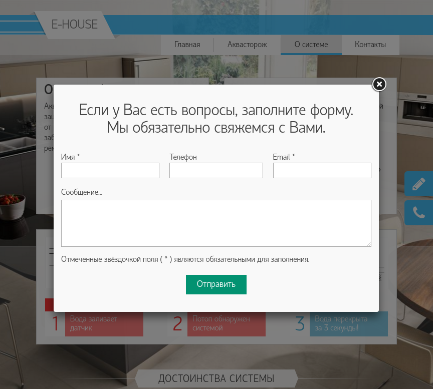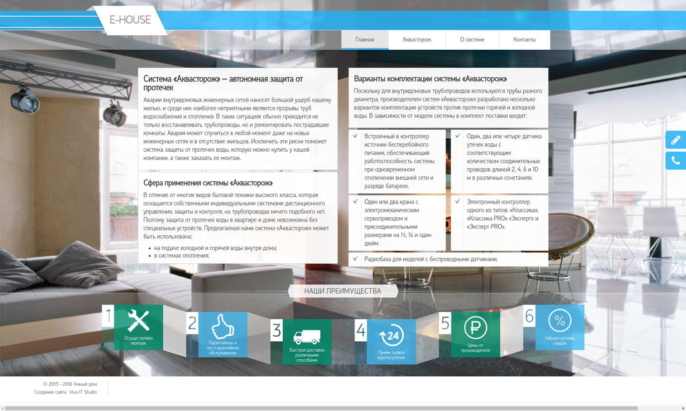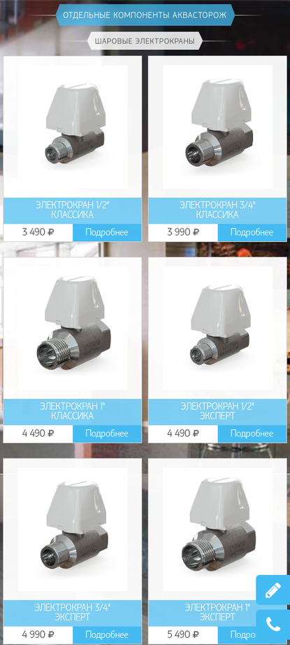 Работа по размещению систем на сайт разбита на несколько этапов. На данный момент на сайте представлен каталог системы защиты от протечек воды в домах и квартирах "Аквасторож". А пока нами внедряеются функции интернет-магазина, вы можете посмотреть скриншоты страниц сайта: