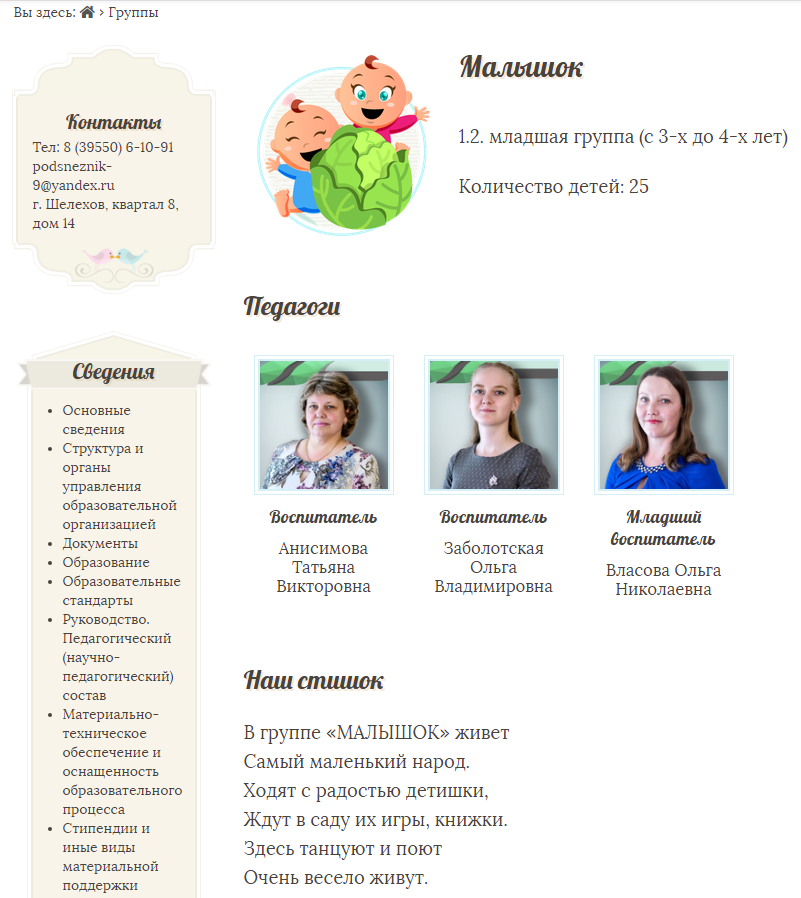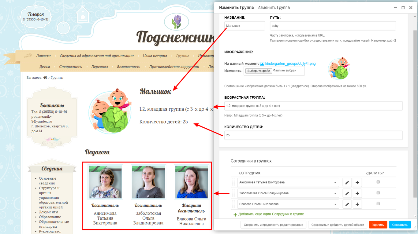 Для удобного размещения информации о воспитателях и их группах разработан отдельный функционал, позволяющий в административной панеле только в одном месте добавлять информацию о группе или воспитателе.