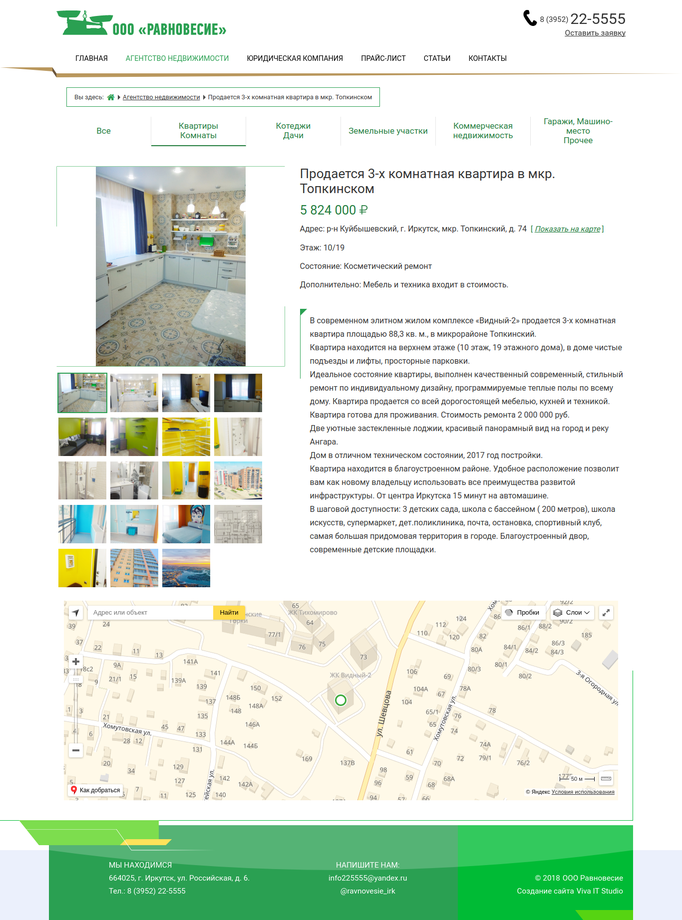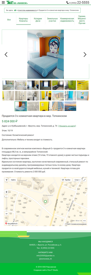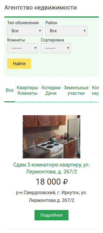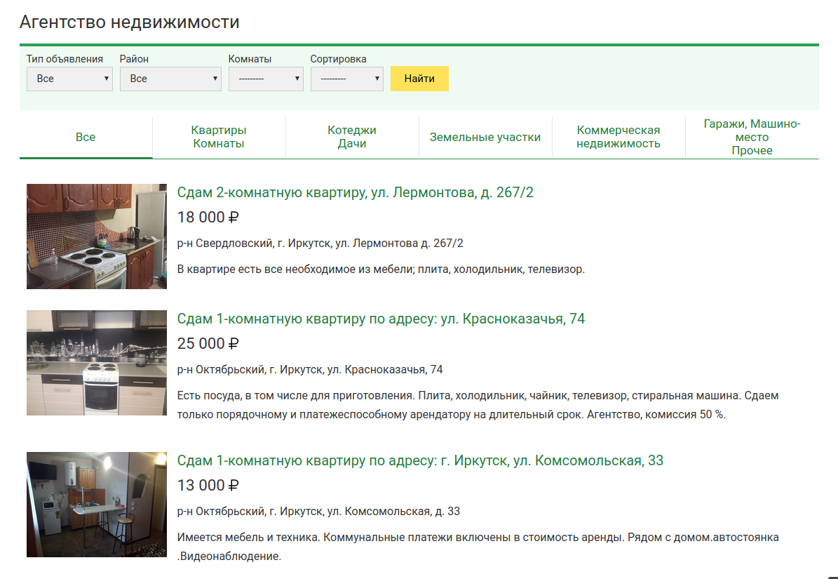 По мере работы с сайтом возникла необходимость добавить подраздел продажи/аренды объектов недвижимости. Для удобства потенциальный покупатель может отфильтровать позиции категории, району, количеству комнат, а также упорядочить по цене.