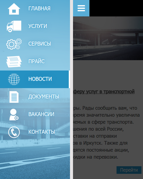 Так же интересно и необычно смотрится реализация отображения меню в мобильной версии - оно слайдом выдвигается сбоку.