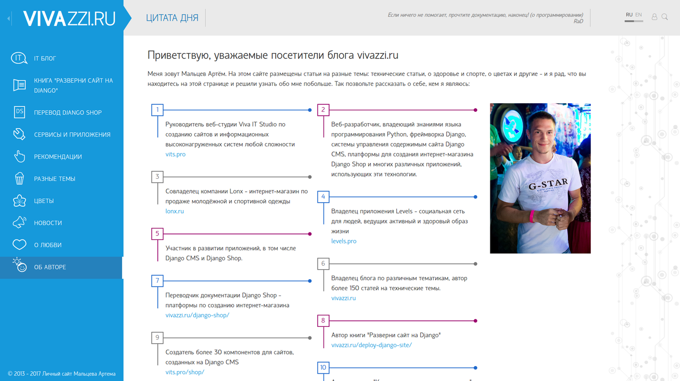 Представляем Вашему вниманию персональный сайт руководителя студии "Viva IT Studio" Мальцева Артёма, в котором Вы найдёте информацию о его основной деятельности и cможете посетить блог по разработке и продвижению сайтов, который будет полезен дизайнерам и веб-разработчикам.