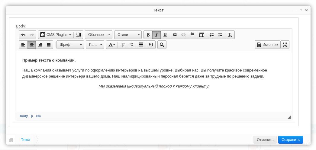 Django CMS – постоянно развивающаяся, удобная, простая в использовании и в тоже время мощная система управления содержимым сайта. Она прекрасно подойдёт как для сайтов-визиток, так и для целых информационных порталов. Повышенное внимание к безопасности, возможность расширения функциональности и редактирование содержимого прямо на страницах сайта (front-end редактирование) – вот что нам нравится в этой CMS.