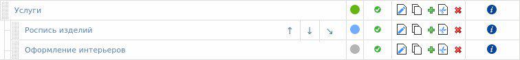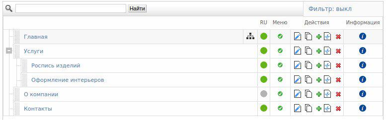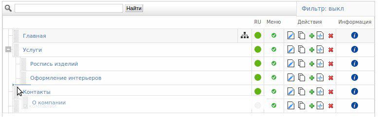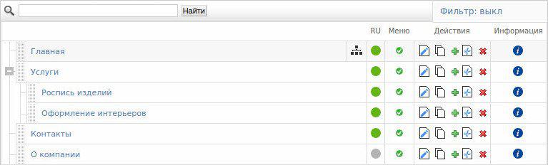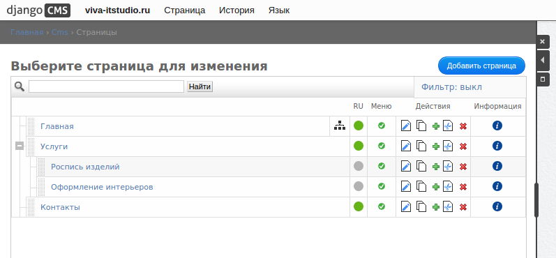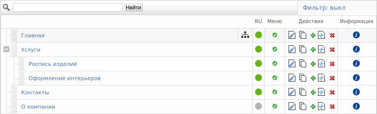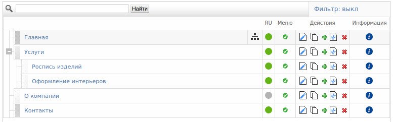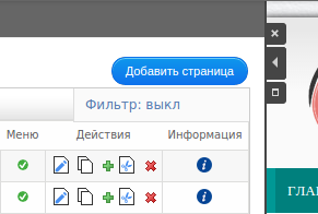Колонка “Действия” содержит кнопки выполняющие следующие функции для данной страницы (перечисление идёт слева направо):