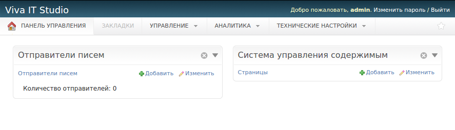 Для того чтобы просмотреть главную страницу административной панели, нужно в меню щёлкнуть по названию сайта (например, “viva-itstudio.ru”) и в открывшемся подменю выбрать пункт “Администрирование…”. Второй способ открыть данную панель в отдельном окне браузера: нужно в адресной строке браузера набрать адрес сайта + /admin, например: viva-itstudio.ru/admin