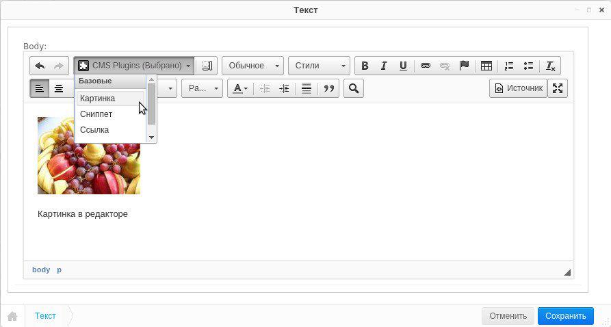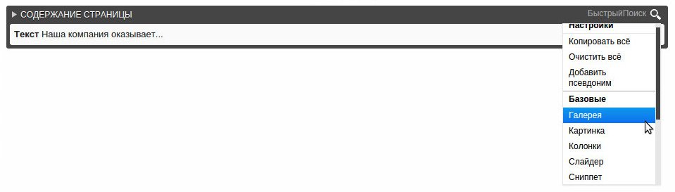 Текстовый редактор компонента “Текст” позволяет добавлять другие компоненты. Мы добавили данную возможность для следующих базовых компонентов: картинка, сниппет, ссылка, файл.
