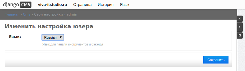 Данная панель содержит настройки авторизованного пользователя CMS. По умолчанию имеется только одно поле настройки “Язык”. Чтобы изменить другие настройки, нужно из меню щёлкнуть по названию сайта и выбрать “Пользователи” (см. пункт меню “Пользователи”).